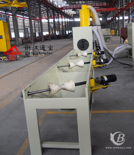 寧波客戶生產(chǎn)的鋼管外壁專用噴砂機(jī)已生產(chǎn)完成,該機(jī)采用電動馬達(dá)傳送噴砂處理產(chǎn)品,電動馬達(dá)配置專用減速器,可自由調(diào)節(jié)控制處理速度;內(nèi)