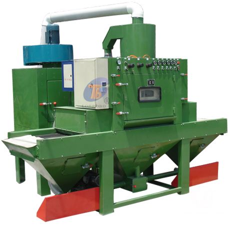 ▓ 原理說明: 采用三角皮帶輸送工件,不會積砂,皮帶速度配合噴砂工藝要求可實現(xiàn)變頻調(diào)速;每支噴槍角度可自由調(diào)節(jié)槍架實現(xiàn)自動變頻搖擺,并可定點噴砂,靈活性強、適用 性廣;采用先進(jìn)的旋風(fēng)分離系統(tǒng)配置,粉塵分離效果好,噴砂效率高;采用PLC電氣先進(jìn)控制系統(tǒng),自動化程度高,穩(wěn)定性好,故障率低;噴嘴采用特制高耐磨硼材料,使用壽命長;獨立的布袋式除塵系統(tǒng),抽塵通風(fēng)效 果良好;(也可選用;脈沖濾芯式除塵);磨料回收采用螺旋輸送及氣力回收相結(jié)合,回收穩(wěn)定性好。 ▓ 輸送式噴砂機(jī)特點: 1,本機(jī)在加工時為封閉式,不會污染環(huán)境; 3,可根據(jù)噴砂工件需要,輸送帶速度采用變頻器控速;